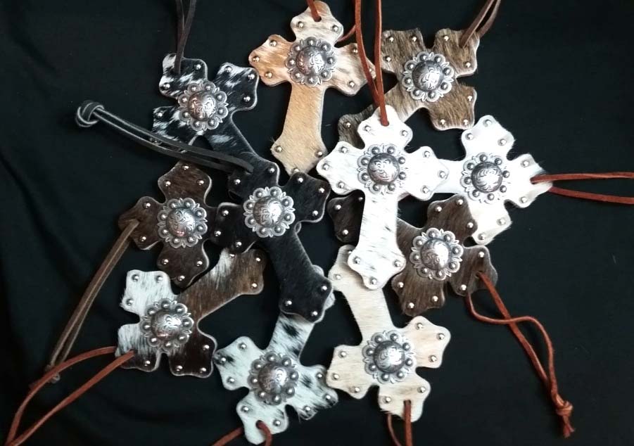 This is a dozen pack of our popular hair on leather roman crosses, plain antique silver crosses, in assorted hides.  Proudly made in the USA.